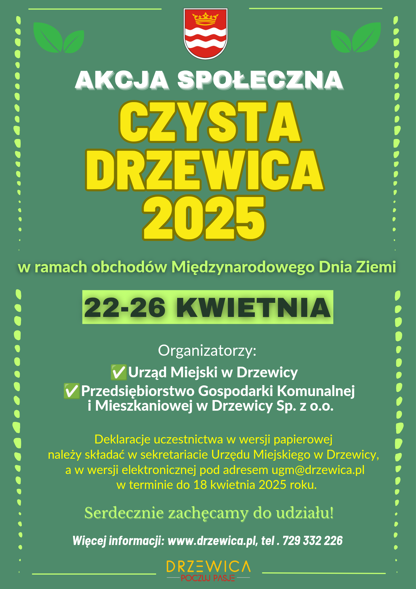 W ramach obchodów Międzynarodowego Dnia Ziemi od 22 do 26 kwietnia 2025 roku na terenie Gminy Drzewica odbywać się będzie akcja społeczna „Czysta Drzewica”. Jej organizatorami są Urząd Miejski w Drzewicy oraz Przedsiębiorstwo Gospodarki Komunalnej i Mieszkaniowej w Drzewicy Sp. z o.o.. Inicjatywa ma na celu promowanie postaw proekologicznych w społeczeństwie oraz dążenie do ograniczenia zmian klimatu.
