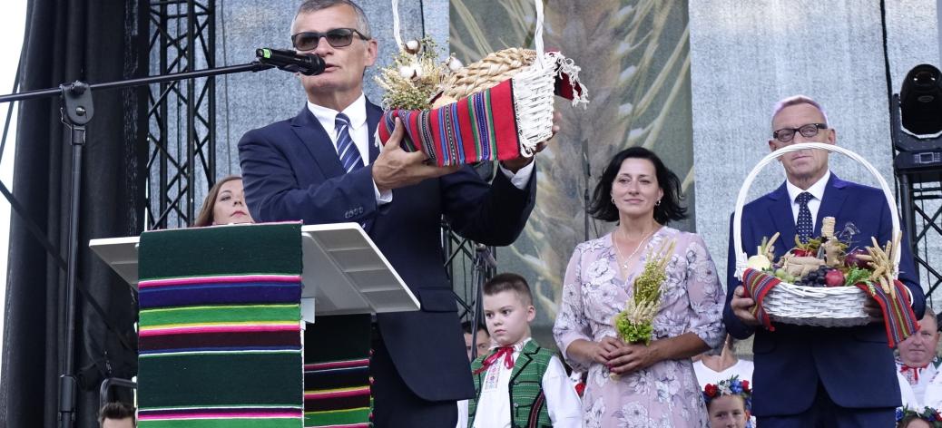 Na scenie starostowie dożynek wręczyli Burmistrzowi Drzewicy bochen chleba wypieczonego z tegorocznej mąki. Burmistrz przyrzekł dzielić chlebem sprawiedliwie - tak, aby nikomu w Gminie Drzewica go nie zabrakło.