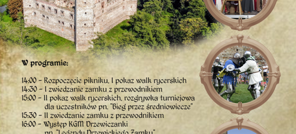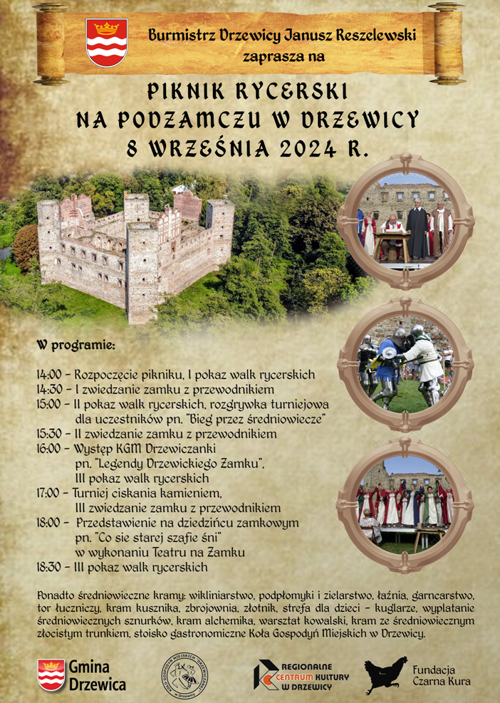 W niedzielę, 8 września 2024 roku na terenie wokół zamku gotycko-renesansowego w Drzewicy odbędzie się Piknik Rycerski organizowany przez Gminę Drzewica oraz Koło Gospodyń Miejskich "Drzewiczanki". Piknik rozpocznie się o godz. 14.00