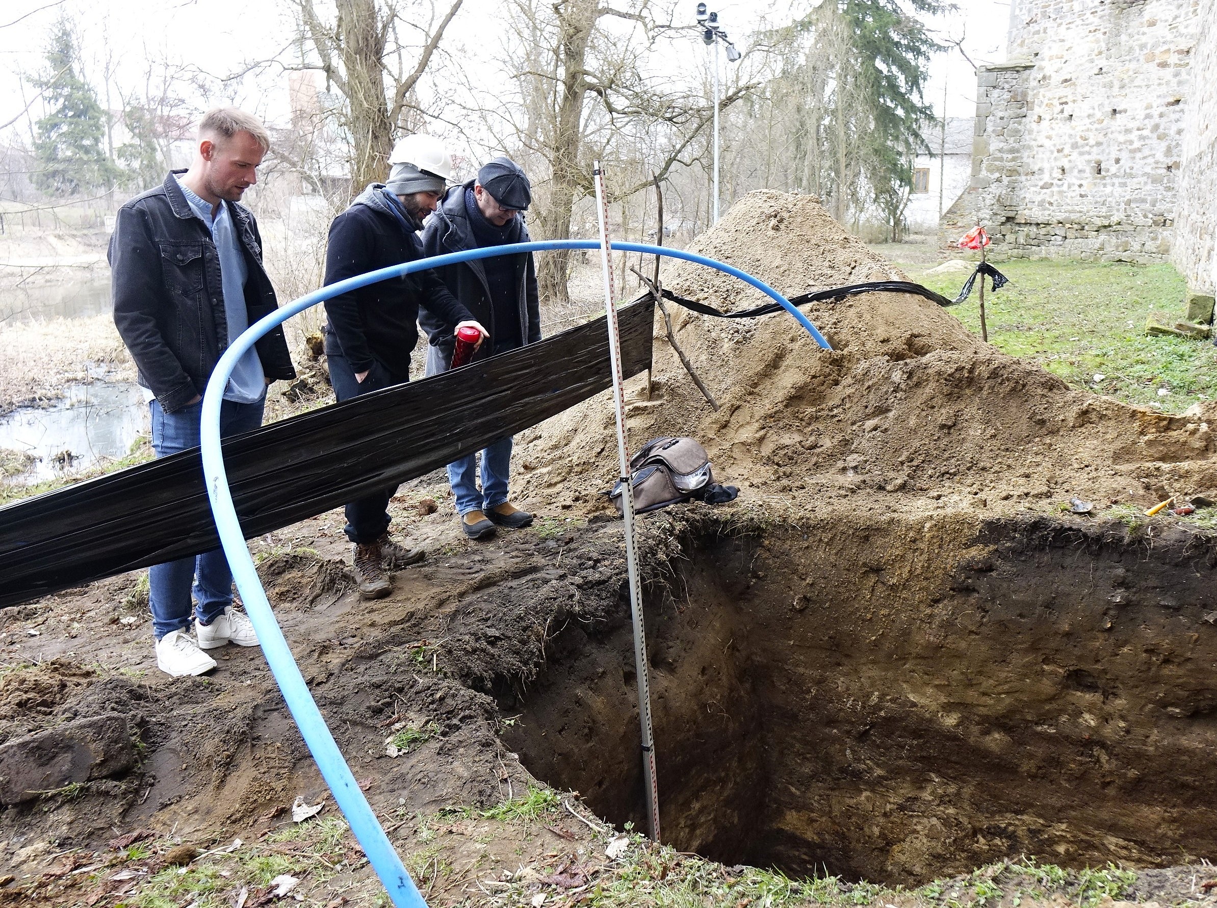 Archeolodzy dokonali tam ziemnego wykopu aż do znajdujących się w wodzie dębowych bali, na których posadowiona jest budowla. Pomiary pokazały, że bale leżą na głębokości 2,8 metra.