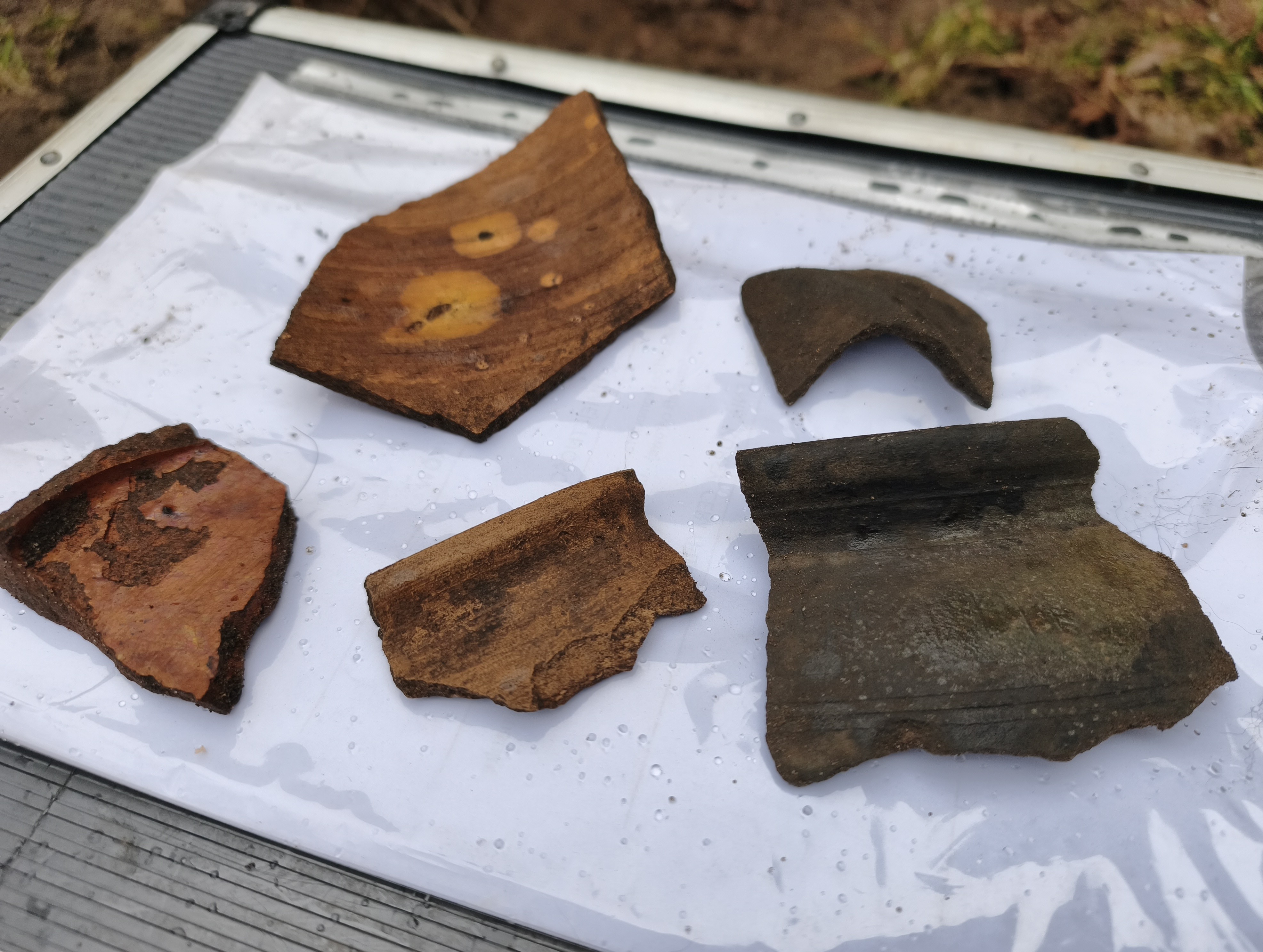 Znalezisko obejmuje m.in. fragmenty historycznej ceramiki. Są to ułamki naczyń użytkowych, prawdopodobnie kuchennych, wykonanych z gliny i wypalanych w wysokiej temperaturze. Krawędź jednego z naczyń jest wyraźnie wywinięta na zewnątrz. Widoczne są również zdobienia w postaci poziomych żłobień.