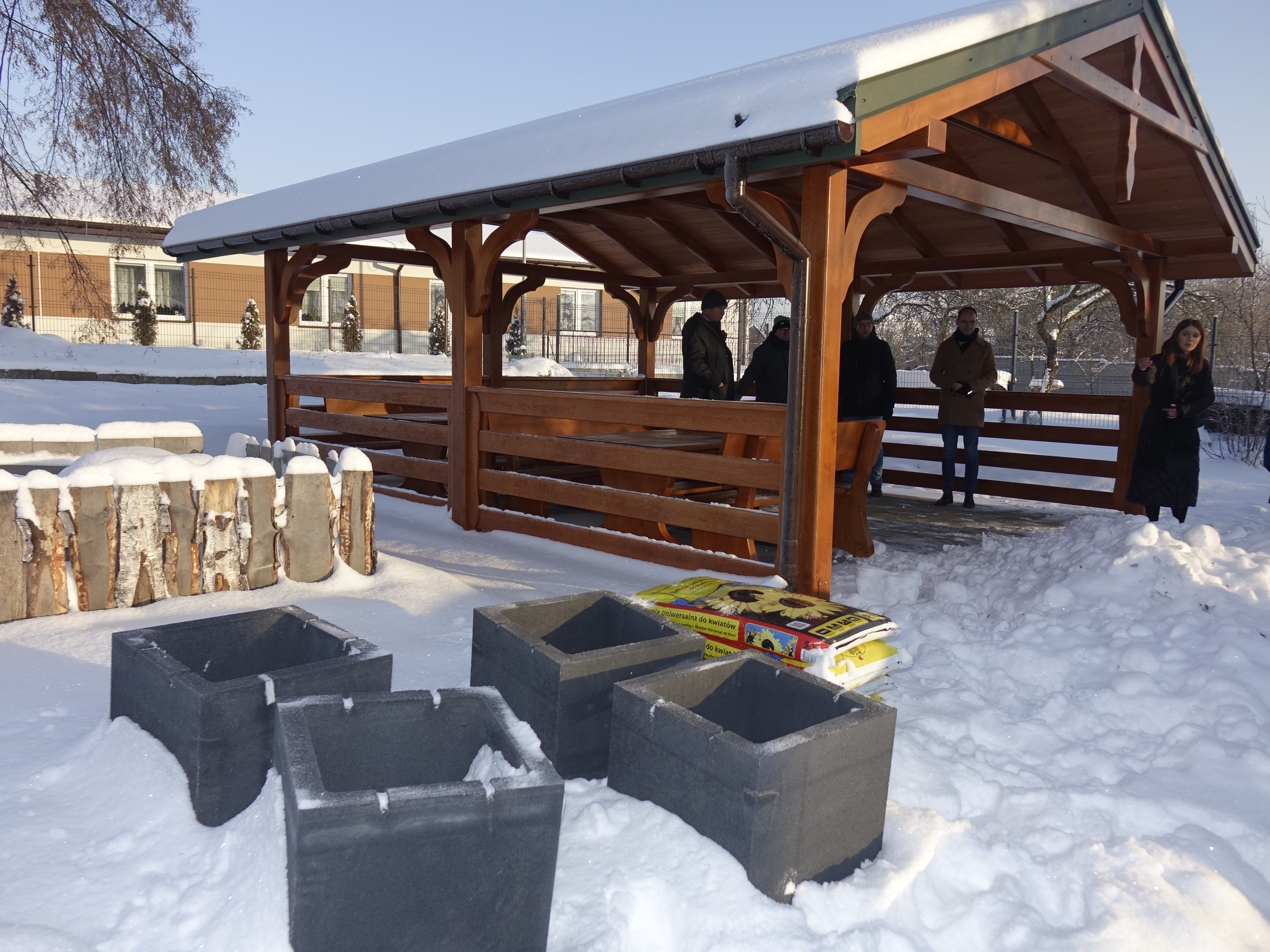 Zakres rzeczowy obejmował również wykonanie trzech stołów i sześciu ławek o konstrukcji drewnianej stanowiących wyposażenie altany. Ponadto dostarczono cztery gazony betonowe wraz z koszem na śmieci, które zamontowano przy nowym obiekcie.