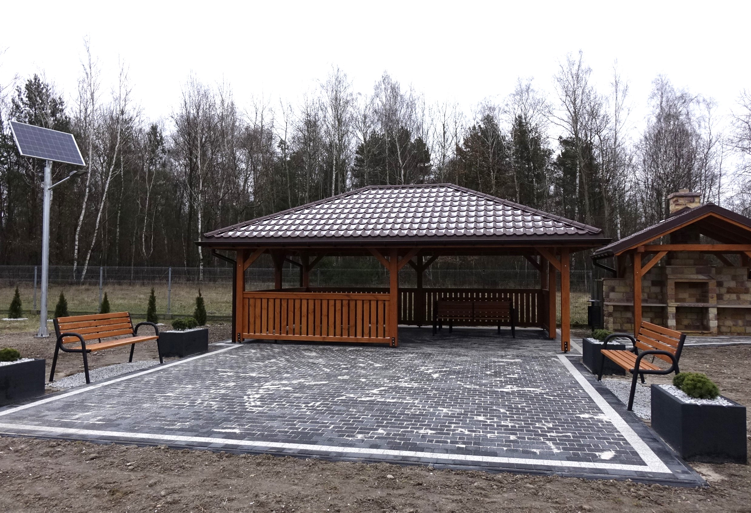 - budowie drewnianej altany z trzema stołami i sześcioma ławkami wraz z utwardzeniem powierzchni zabudowy z kostki betonowej,