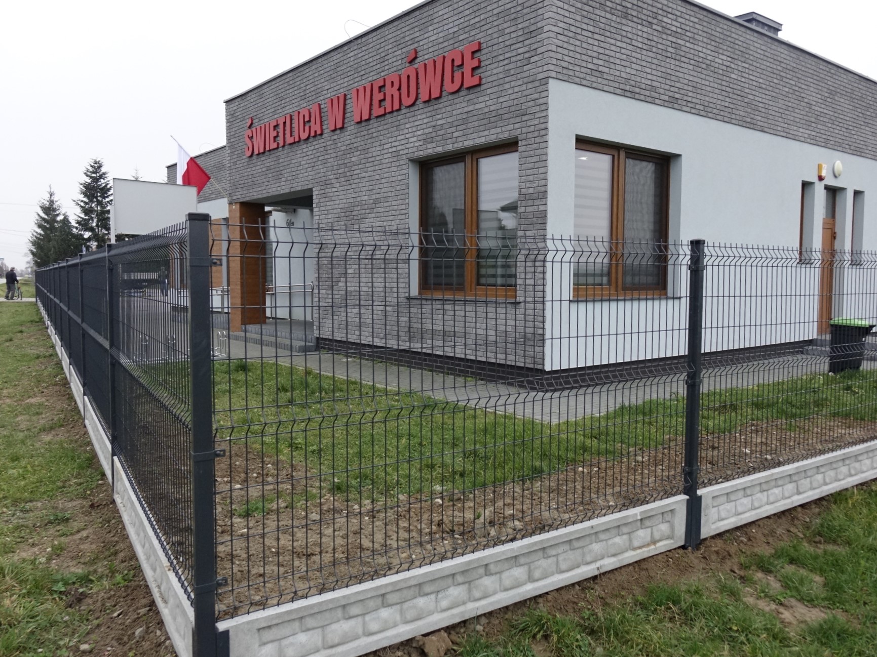 Inwestycja pn. „Budowa ogrodzenia świetlicy wiejskiej w Werówce” polegała na wykonaniu ogrodzenia o długości 91 m z siatki panelowej oraz dostawie i montażu trzech furtek, bramy dwuskrzydłowej i bramy przesuwnej jednoskrzydłowej.