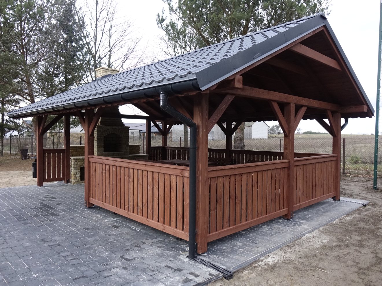 - budowie drewnianej altany o wymiarach 5x7 m z trzema stołami i sześcioma ławkami wraz z wykonaniem utwardzenia terenu z kostki betonowej;