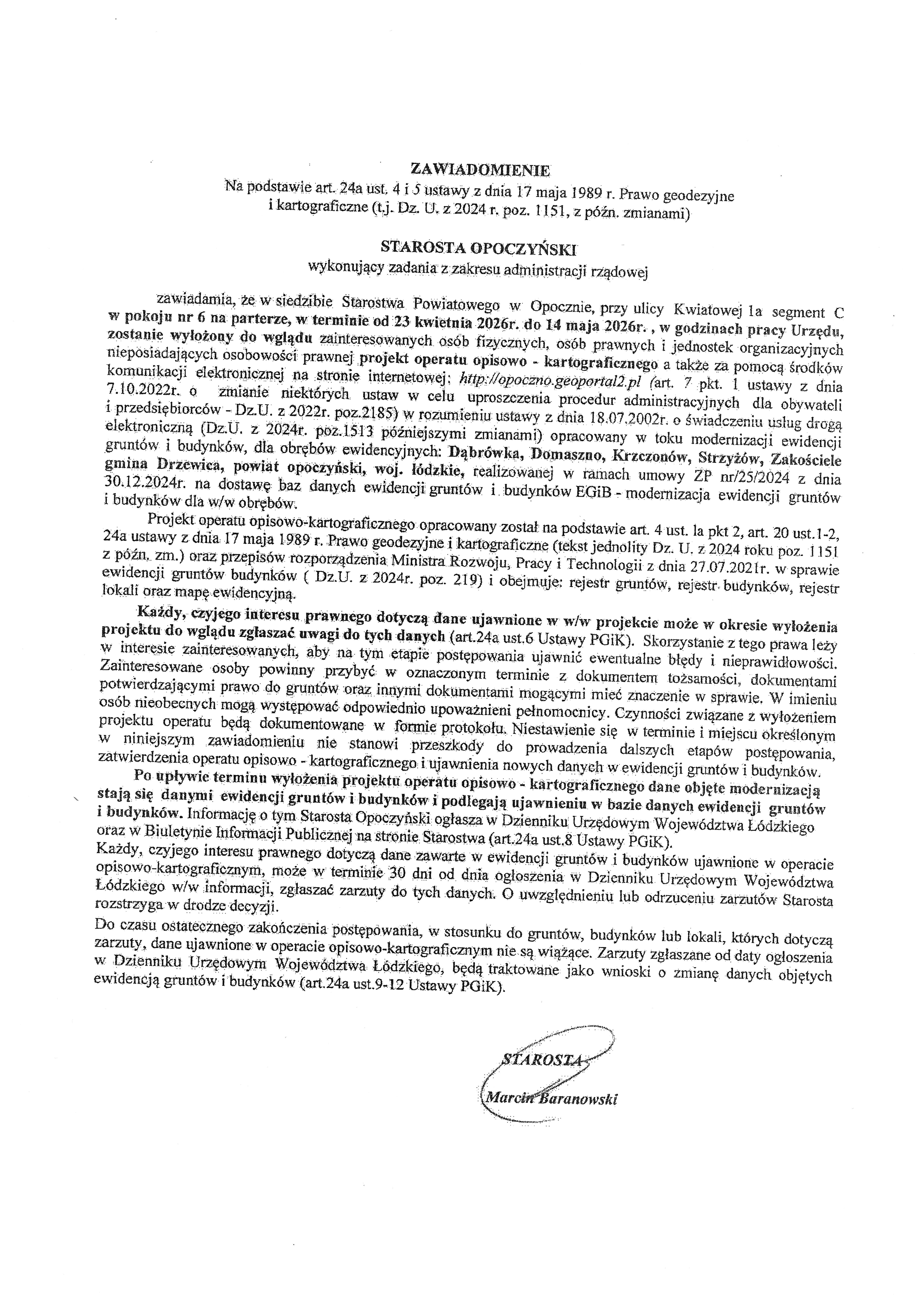 Zawiadomienie Starosty Opoczyńskiego o wyłożeniu do wglądu projektu operatu opisowo-kartograficznego modernizacji ewidencji gruntów i budynków dla obrębów ewidencyjnych Dąbrówka, Domaszno, Krzczonów, Strzyżów, Zakościele